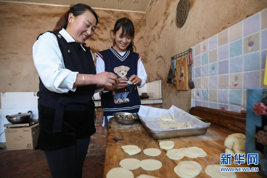 2月11日,元古堆村村民韩丽君(右)和母亲在家里包饺子,准备年夜饭。新华社记者 马希平 摄