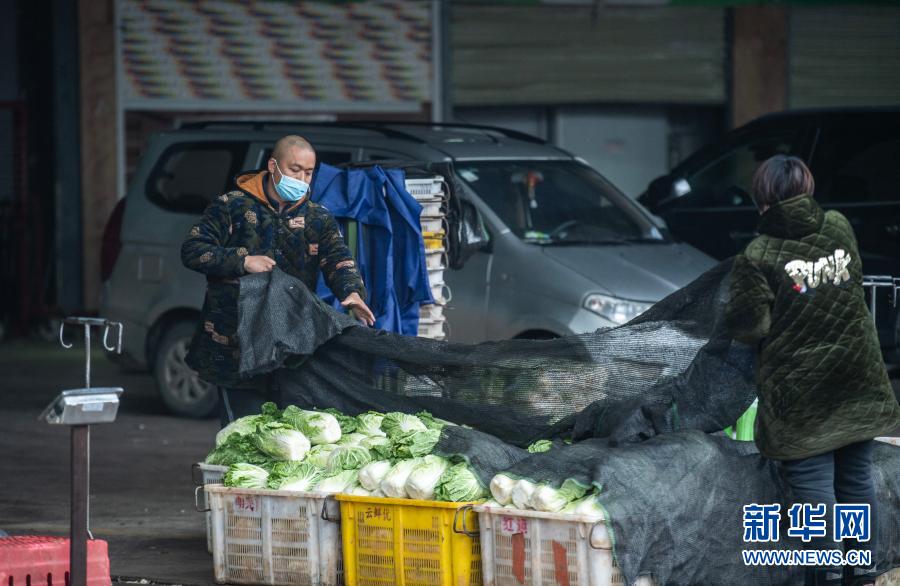 在贵阳农产品物流园,商户给白菜盖上篷布(2月9日摄)。