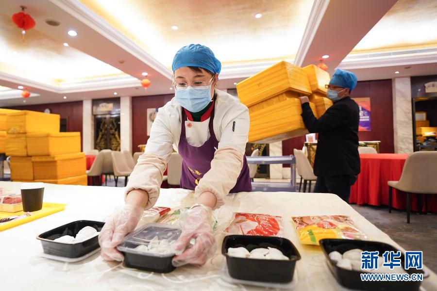 2月11日,在北京市大兴区一处集中医学观察点,工作人员为隔离观察人员分装饺子。