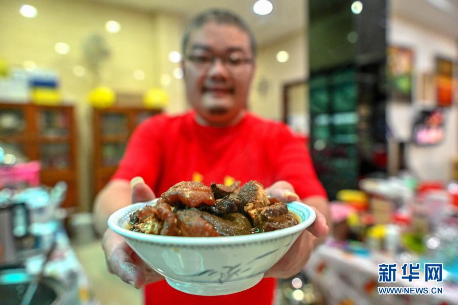 2月11日,在马来西亚吉隆坡,一名当地华人展示年夜饭。