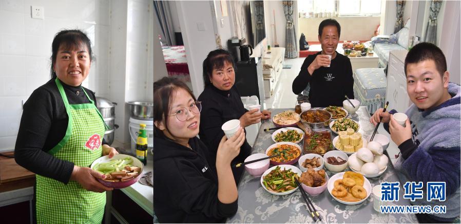 拼版照片:左图为2月11日,延川县文安驿镇梁家河村村民贺随兰在搬迁小区的新家中准备年夜饭;右图为2月11日,延川县文安驿镇梁家河村村民贺随兰(左二)、贺和林(右二)和儿女在搬迁小区的新家中一起吃年夜饭。55岁的贺和林一家是梁家河村的脱贫户。随着脱贫攻坚工作的持续开展,贺和林家曾经紧巴巴的日子,渐渐宽裕了起来,全家一年的收入突破了七万元。今年贺和林家的年夜饭桌上,除了有陕北传统的炸油圈、炸油糕、酥肉等菜肴外,还有大盘鸡、豆豉红烧鱼等“硬菜”。