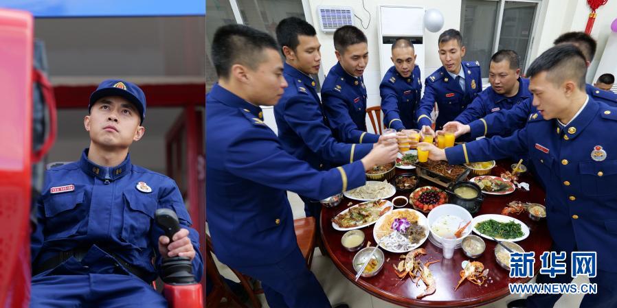 拼版照片:左图:2月11日,胡亮在测试消防云梯车的操作性能;右图:2月11日,胡亮(左四)与战友们在吃年夜饭,举杯庆祝新年。1990年出生的胡亮来自四川省江油市,是福建省厦门市集美区杏林消防救援站的一名消防云梯车驾驶员。自参加消防救援工作以来,他已经连续12年没有回家过年。今年除夕夜,他要和战友们一起到城中村去执勤巡逻,确保消防安全。杏林消防救援站今年为大家准备了丰盛的年夜饭,有龙虾粥、粉丝蒸螃蟹、水煮三鲜、羊肉煲、饺子……由于除夕夜有执勤任务,他们的年夜饭提前到下午5点开饭。年夜饭后,胡亮与战友们出发前往当地城中村去执勤巡逻。