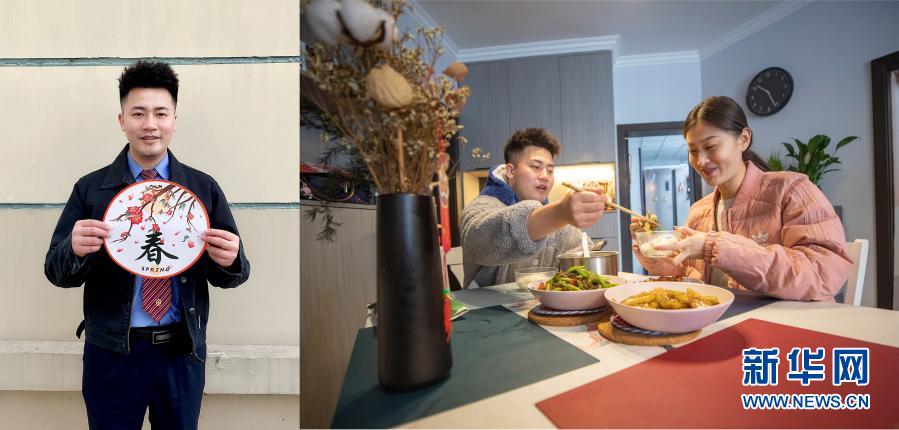 拼版照片:左图为2月11日,中国铁路成都局集团有限公司重庆客运段列车长余源在线上向老家的亲人拜年;右图为2月11日中午,余源(左)和妻子徐婧婧在家中提前吃年夜饭。在2013年相识相恋于大学的余源和徐婧婧,毕业后双双进入成都铁路局,只是徐婧婧在成都客运段,余源在重庆客运段。2020年9月,两人领证结婚。今年是两人参加工作后一起度过的第七个春运,也是两人新婚后的第一个春运。除夕这天,因为工作安排,夫妻俩不能享受新婚后的第一次团圆饭,因此,两人特意将“年夜饭”提前到了中午。