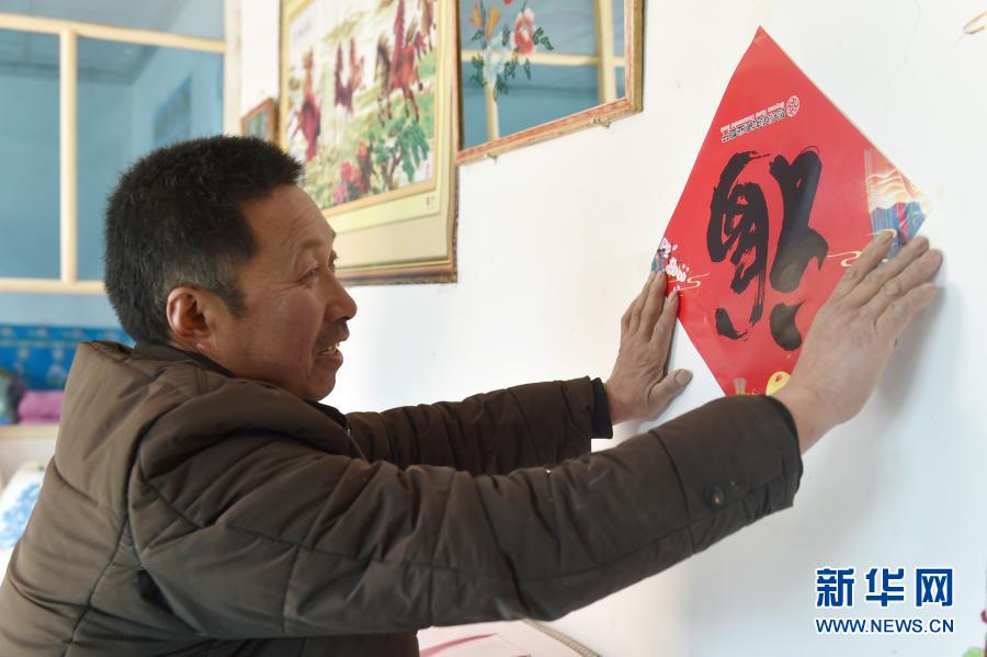 2月11日,黄登明在家里贴福字。