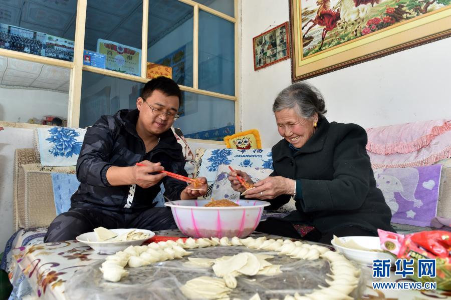 2月11日,黄登明的大儿子黄宁和奶奶一起包饺子。