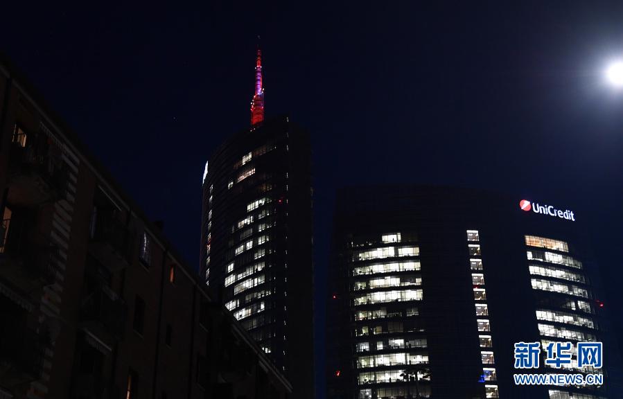 为庆祝中国春节,意大利米兰地标性建筑裕信银行塔的塔顶当日点亮“中国红”。