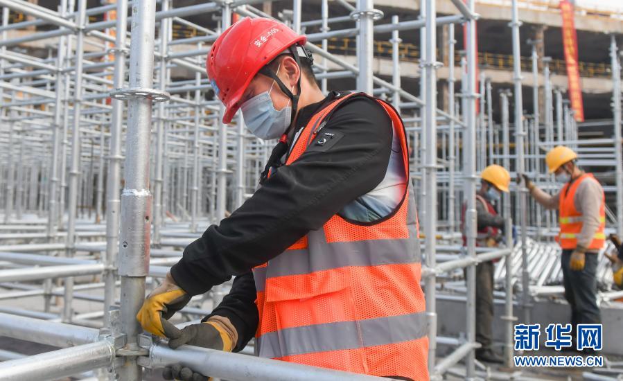 中建三局总承包公司工人李平(左)在武汉长江中心项目工地工作(2月11日摄)。新华社记者 程敏 摄