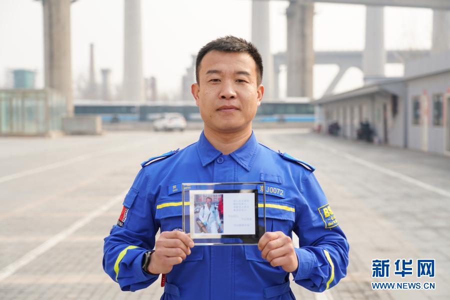 在北京市丰台区一处文化产业园,郭猛拿着2020年执行消杀任务时的照片(2月11日摄)。新华社记者 陈钟昊 摄