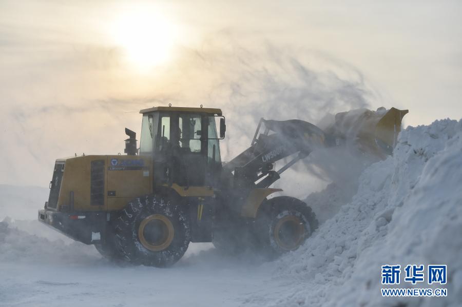 2月11日早晨,一辆铲车在锡盟换流站的进站小道上清理积雪。