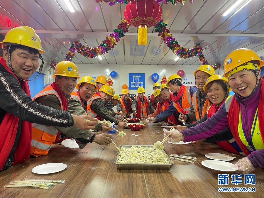 2月11日,在位于北京的中建三局月坛北街25号院项目部,工人们在吃团圆饭。新华社发