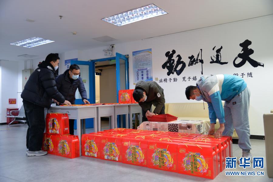 2月9日,北京交通大学辅导员和学生志愿者在整理为留校学生准备的新春礼包。新华社记者 徐钦 摄