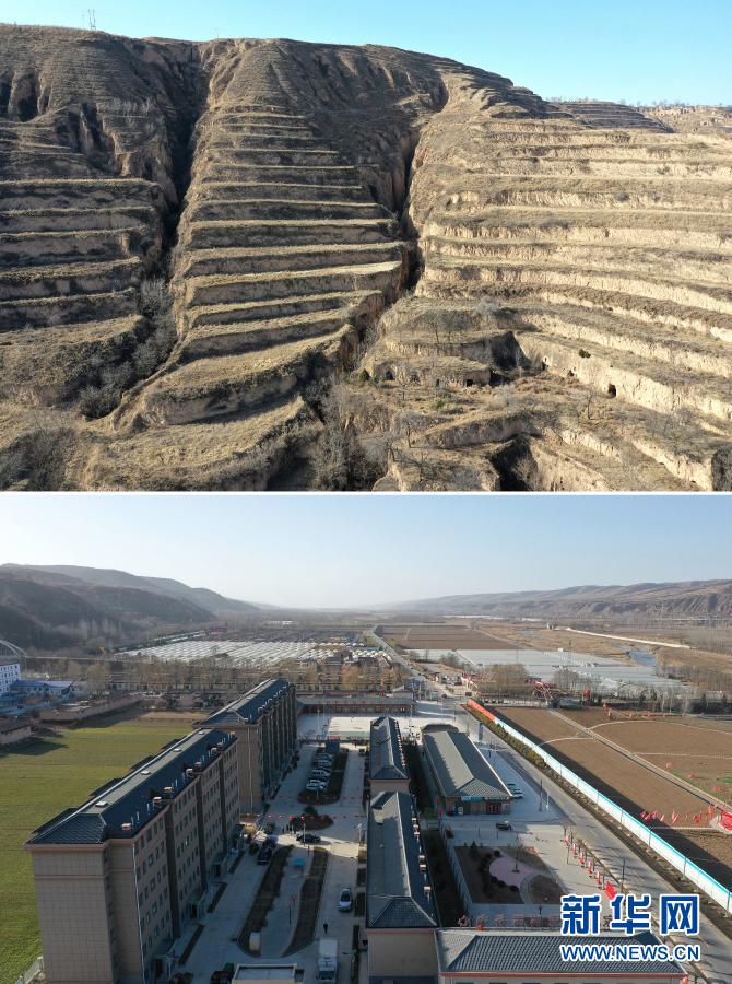 这是一张拼版照片。上图:朱惠平家过去在大山深处居住的窑洞(2月3日摄,无人机照片);下图:朱惠平家现在居住的朱家涧村易地扶贫搬迁安置小区的楼房(2月3日摄,无人机照片)。新华社记者 杜哲宇 摄