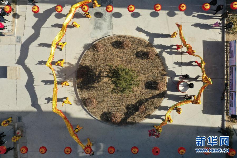 朱家涧村的村民进行舞龙舞狮彩排,迎接脱贫后的第一个春节(2月3日摄,无人机照片)。新华社记者 杜哲宇 摄