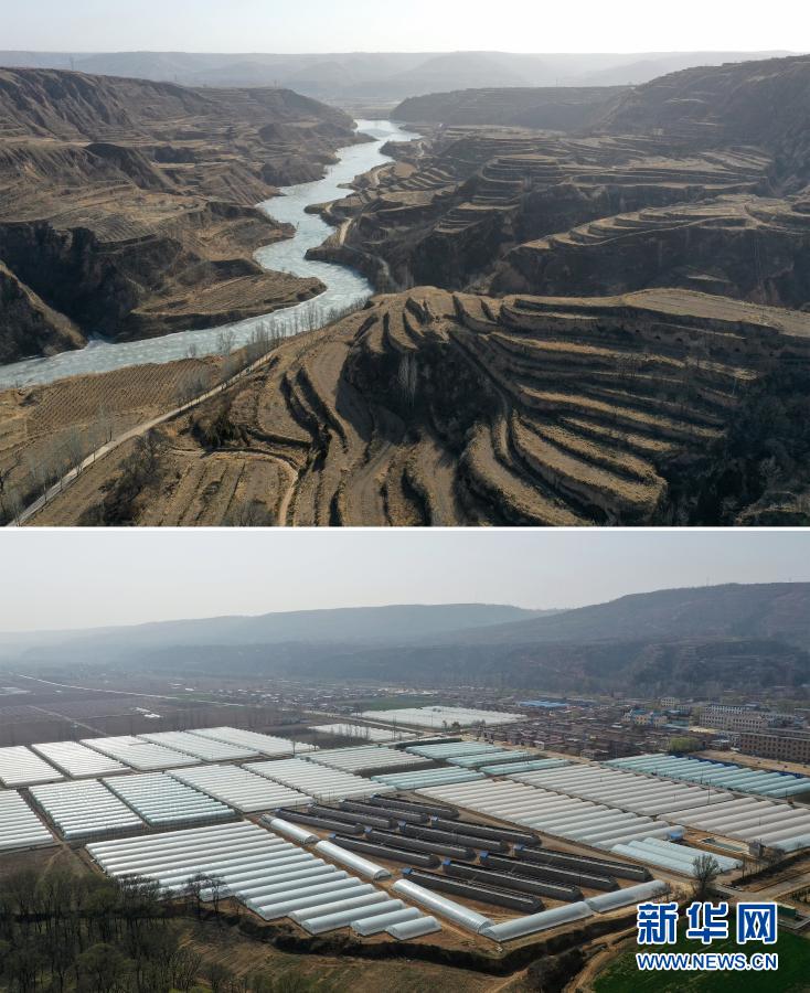 这是一张拼版照片。上图:朱家涧村易地扶贫搬迁之前所在大山的地貌(2月3日新华社记者杜哲宇摄,无人机照片);下图:朱家涧村易地扶贫搬迁后新建成的设施蔬菜产业园区(2020年3月20日新华社记者陈斌摄,无人机照片)。新华社发
