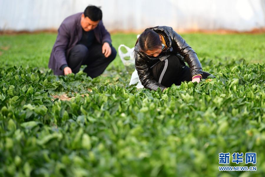 妻子李海玲和朱惠平一起在自家的蔬菜大棚内劳作(2月2日摄)。新华社记者 陈斌 摄