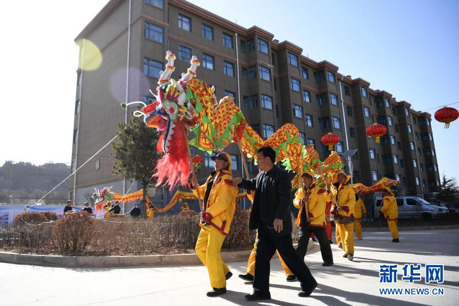朱惠平(前右)组织村民进行舞龙舞狮彩排,迎接脱贫后的第一个春节(2月3日摄)。新华社记者 陈斌 摄