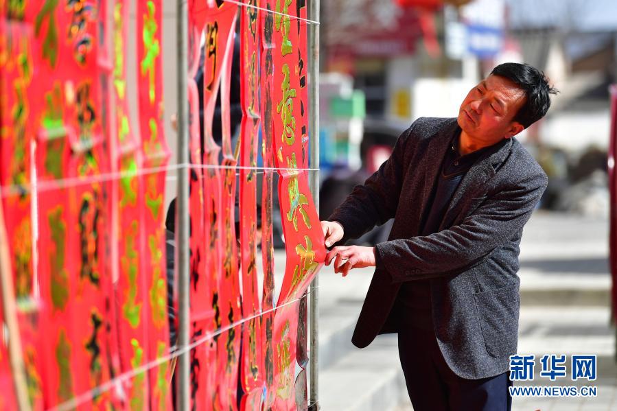 朱惠平在农村年货市场上挑选对联(2月3日摄)。新华社记者 陈斌 摄