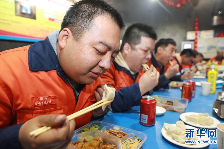 2月11日,在金川集团三矿区采矿二工区井下食堂,工人们一起吃年夜饭。