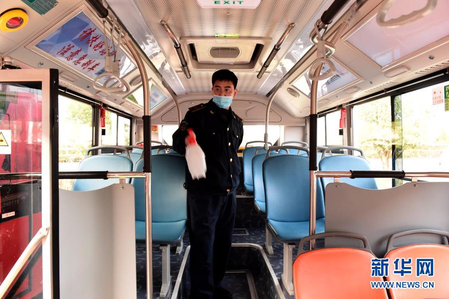 2月11日,夏登雷在发车前为公交车消毒。新华社记者 黄博涵 摄