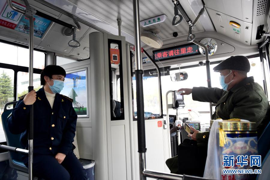 2月11日,王宗艳(左)和经常乘坐66路公交车的乘客交谈。新华社记者 黄博涵 摄