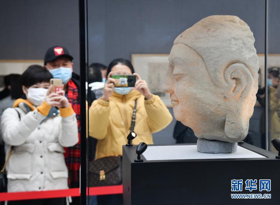 2月12日,参观者在展厅中拍摄展出的天龙山石窟第8窟北壁主尊佛首。