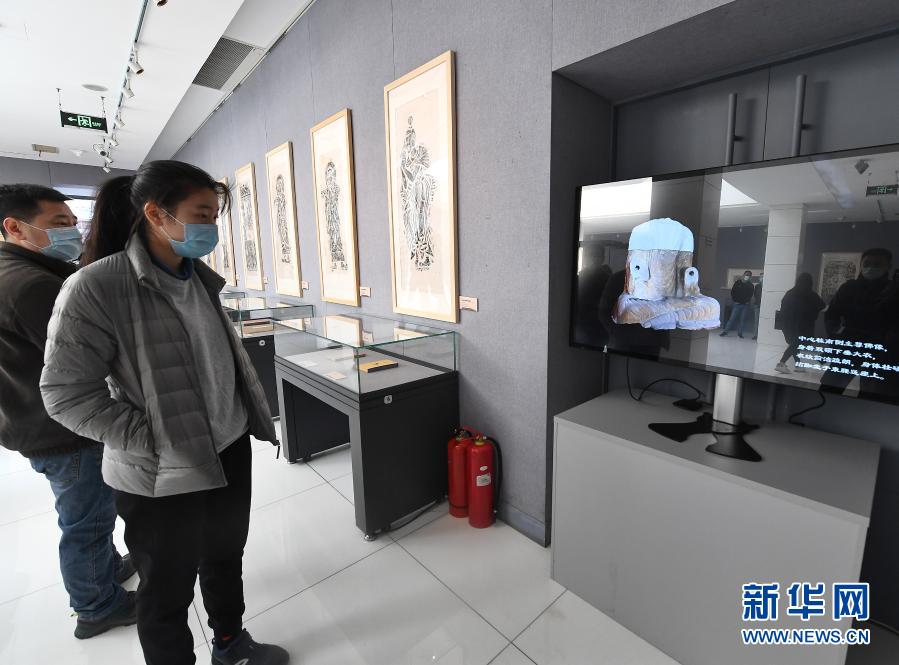2月12日,参观者在展厅观看天龙山石窟及其文物的视频展示。