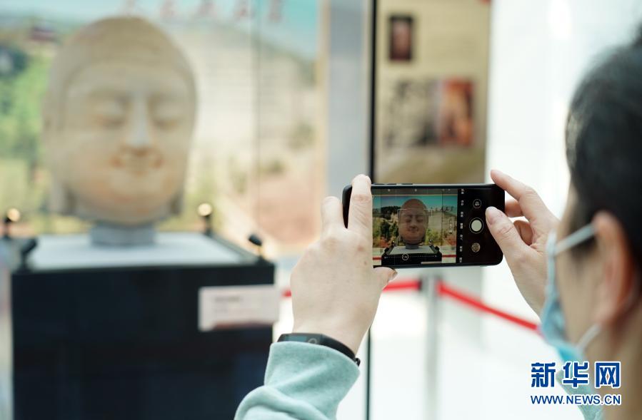 2月12日,在北京鲁迅博物馆,观众拍摄天龙山石窟佛首。