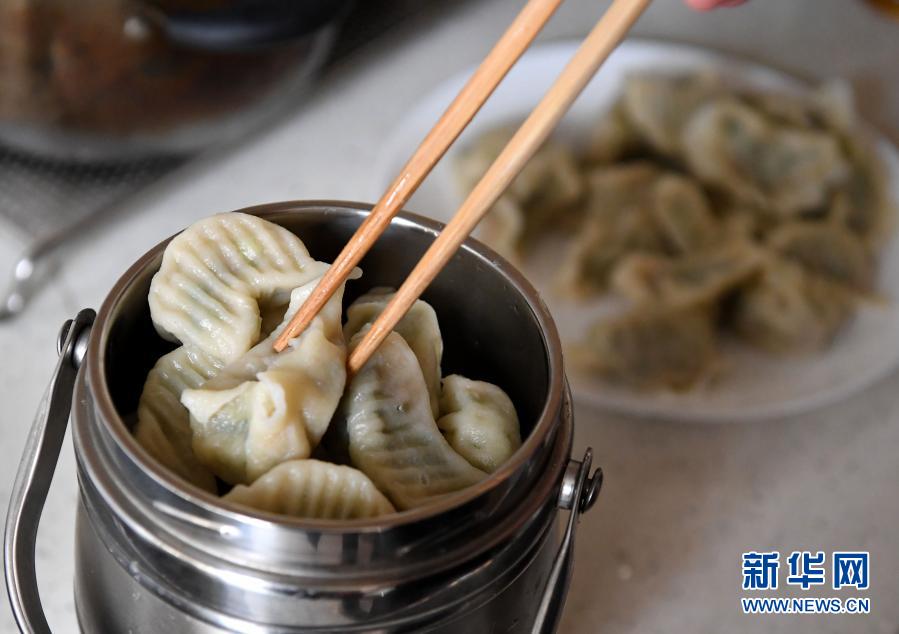 郝满玲在家里将煮好的饺子装进保温桶(2月11日摄)。