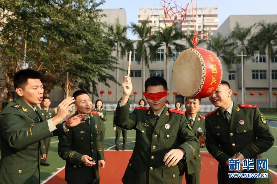 2月12日,武警海南总队某部官兵在游园活动中做游戏。