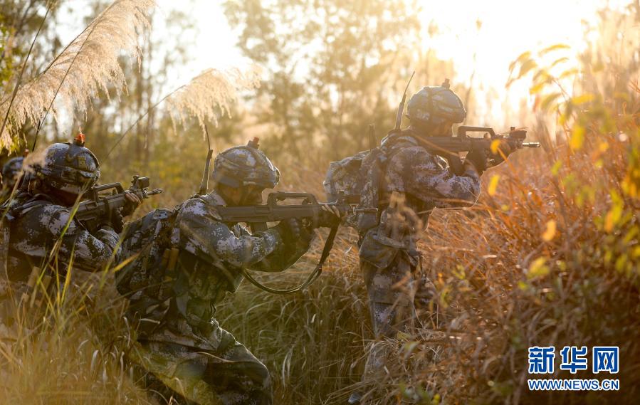 2月7日,海军陆战队某旅组织综合演练,陆战队员在芦苇丛中搜索藏匿的“敌人”。