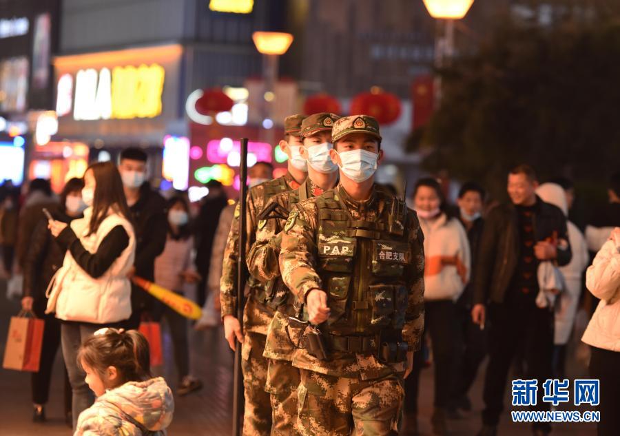 2月11日,武警安徽总队合肥支队执勤十一中队官兵在合肥淮河路步行街巡逻执勤。