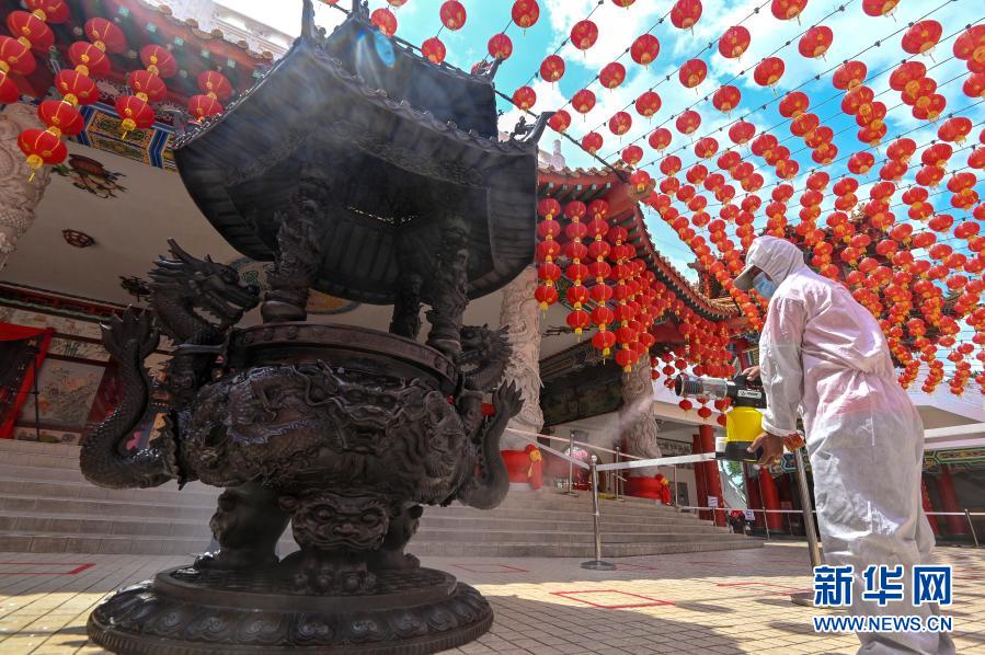2月12日,工作人员在马来西亚吉隆坡的一处庙宇内消毒。