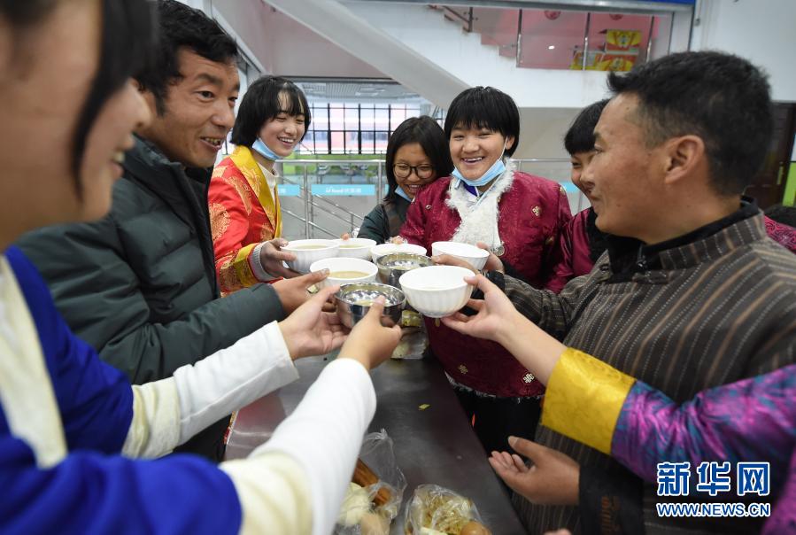 2月12日,合肥市第三十五中学西藏班的老师和学生们一起喝藏式甜茶庆祝藏历新年和农历春节。新华社记者 周牧 摄