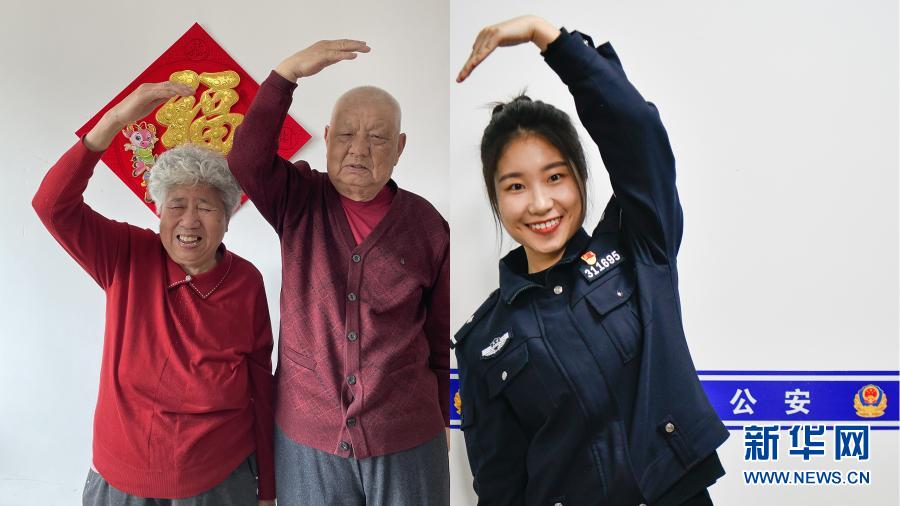 拼版照片:左图为2月11日,在河北邯郸居住的杨晓惠的爷爷与奶奶在家中比心(王洪超 摄);右图为2月11日,杨晓惠在天津市红桥区芥园派出所比心(孙凡越 摄)。