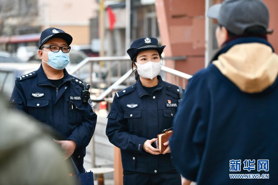 2月11日,在天津市红桥区隆春里社区,杨晓惠(中)与辅警郝旭(左)向晨练的社区居民问询社区情况。新华社发(孙凡越摄)