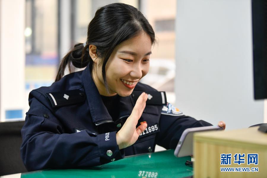 2月11日,在天津市红桥区芥园派出所,杨晓惠与在河北邯郸的爷爷奶奶视频通话。新华社发(孙凡越摄)