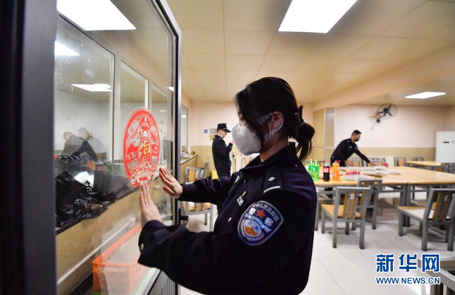 2月11日,在天津市红桥区芥园派出所的餐厅,杨晓惠在吃年夜饭前贴窗花。新华社发(孙凡越摄)