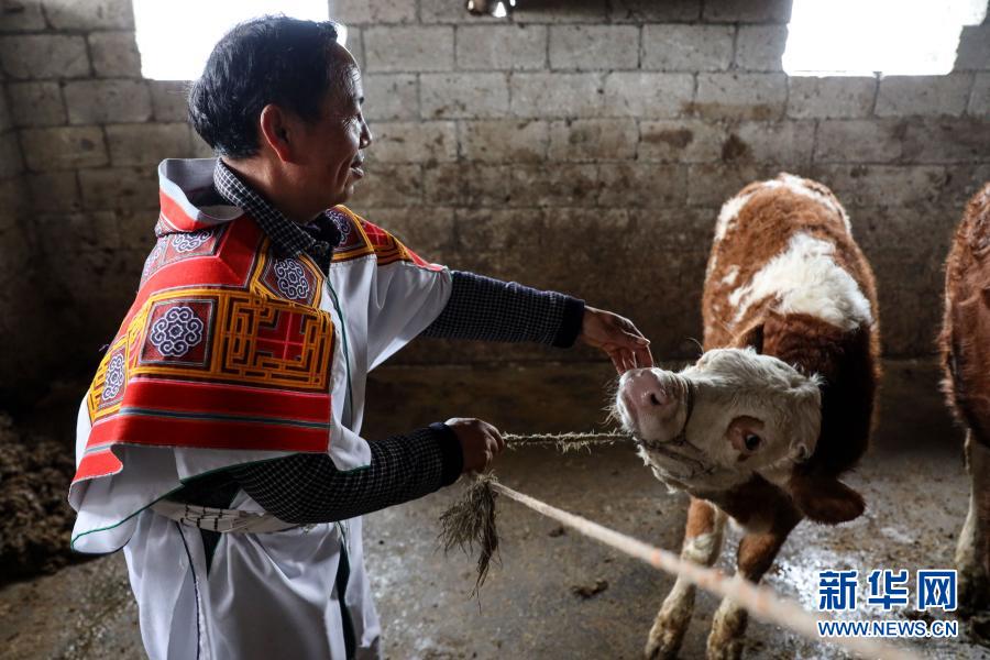 2月12日,苗族村民马德顺在牛棚内查看牛的情况。新华社记者 欧东衢 摄