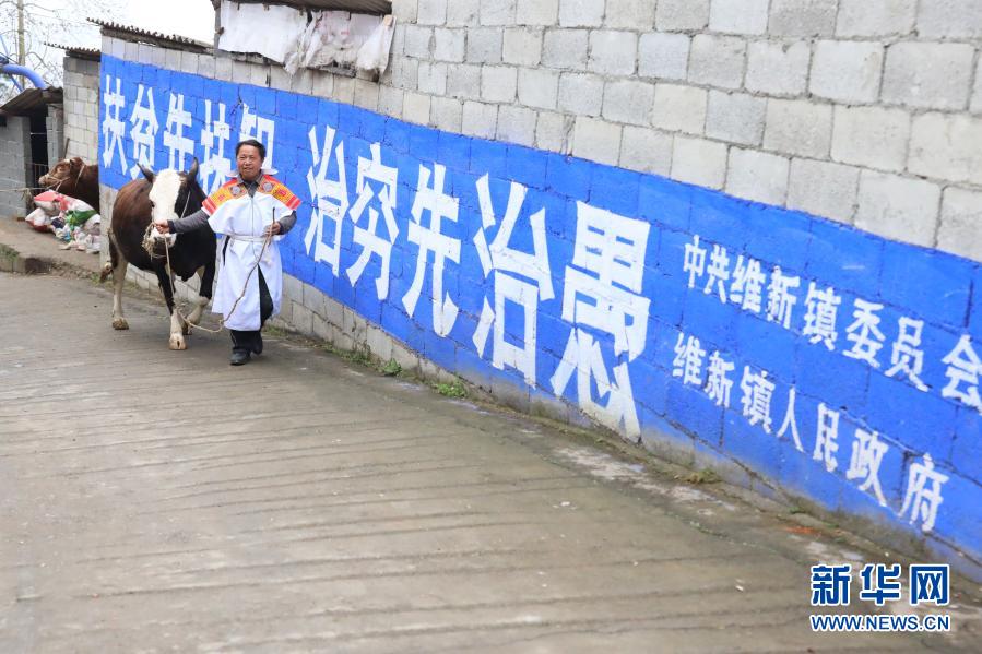 2月12日,苗族村民马德顺牵着牛从维新镇坪子社区内经过。新华社记者 欧东衢 摄