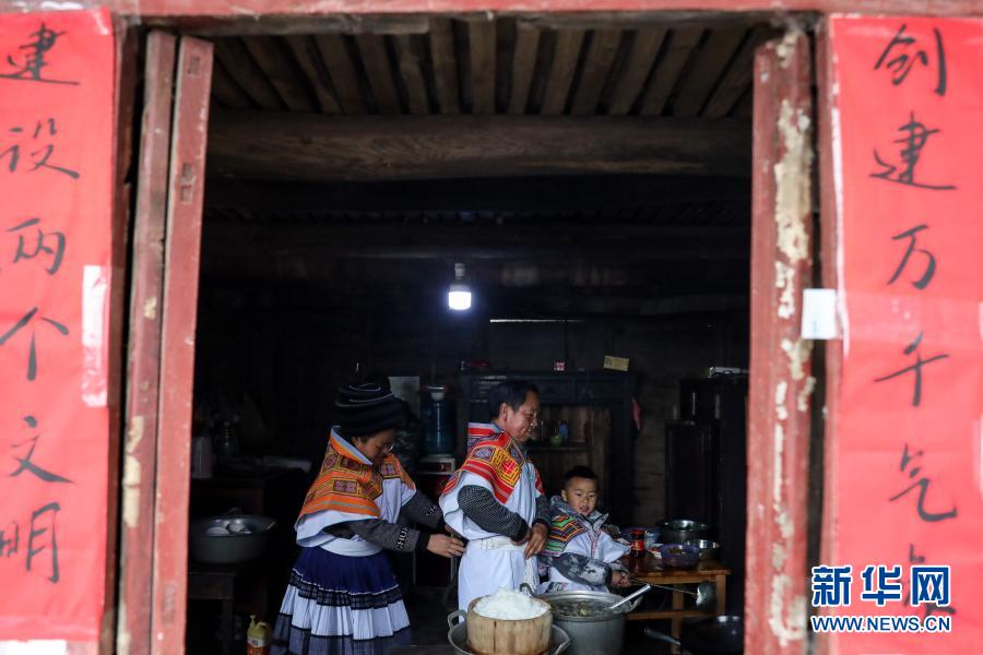 2月12日,苗族村民马德顺的妻子(左)在给他整理苗族服饰。新华社记者 欧东衢 摄