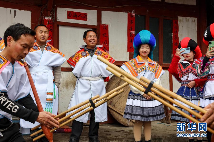 2月12日,苗族村民马德顺(中)在观看芦笙舞。新华社记者 欧东衢 摄