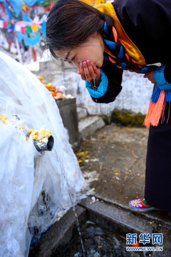 2月12日,在西藏自治区山南市乃东区泽当镇,格央和父母一起,在藏历新年第一天转山祈福。这是格央在饮用“吉祥水”。