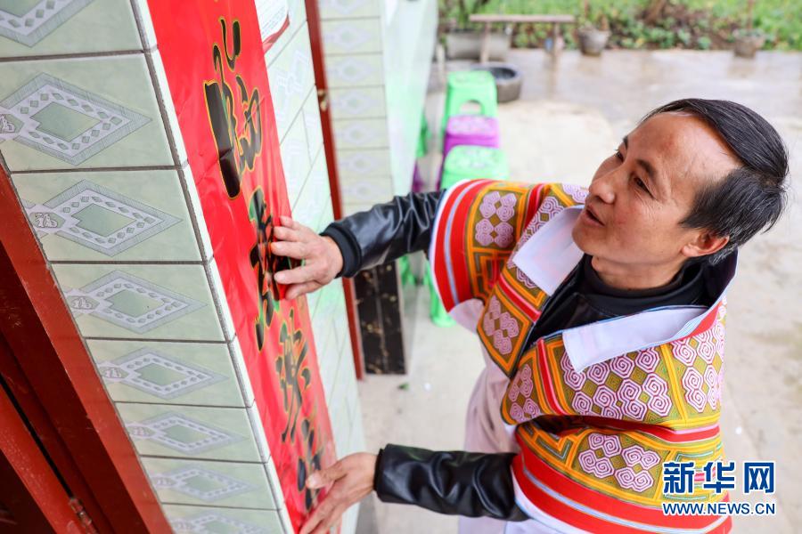 2月10日,苗族村民马雍在家中贴春联。新华社记者 欧东衢 摄