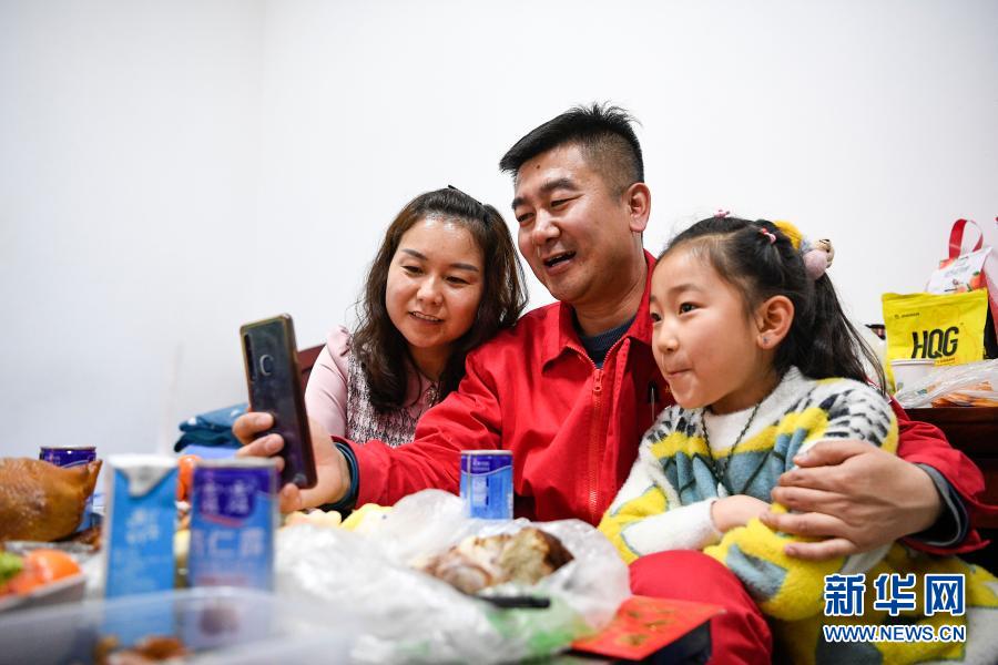 2月11日除夕夜,王涛(中)和妻子女儿在宿舍同在银川的父母和2岁的儿子通视频电话。