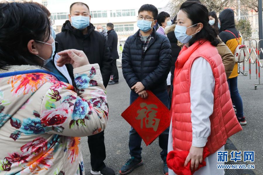 2月12日,喜大夫(中)和同事们到达北京市海淀区一处集中医学观察点,一边互致新年问候一边进行简单交接。