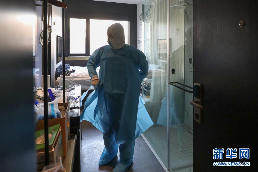2月12日,喜大夫在北京市海淀区一处集中医学观察点穿防护服。