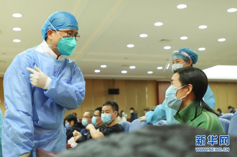 2月4日,喜大夫在北京市海淀区一处临时新冠疫苗接种点回答接种者的问题。