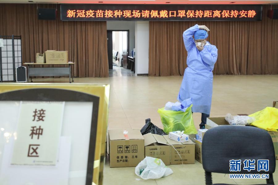 2月10日,喜大夫在北京市海淀区一处临时新冠疫苗接种点穿戴防护用品。