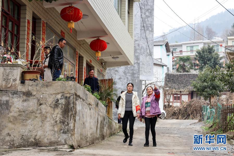2月13日,吴穷(右一)和村干部吴洪梅在坪子社区走访。新华社记者 欧东衢摄