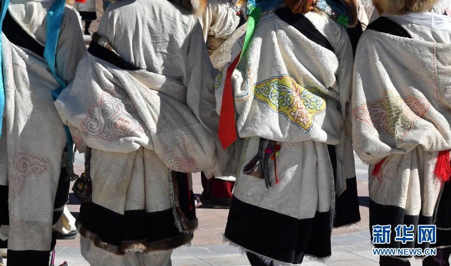 藏北当雄县几名男子的羊皮袍子上的美丽花纹(2月12日摄)